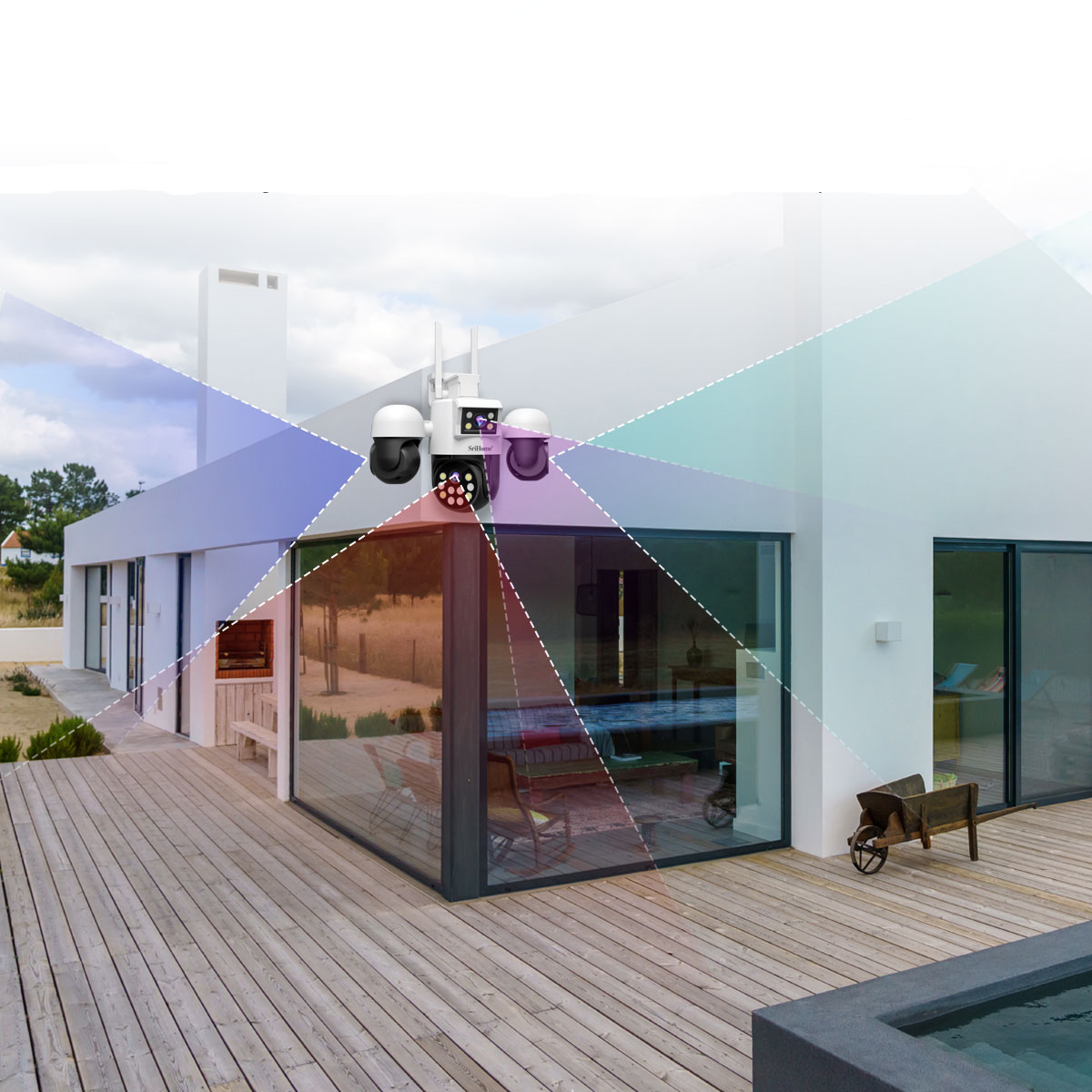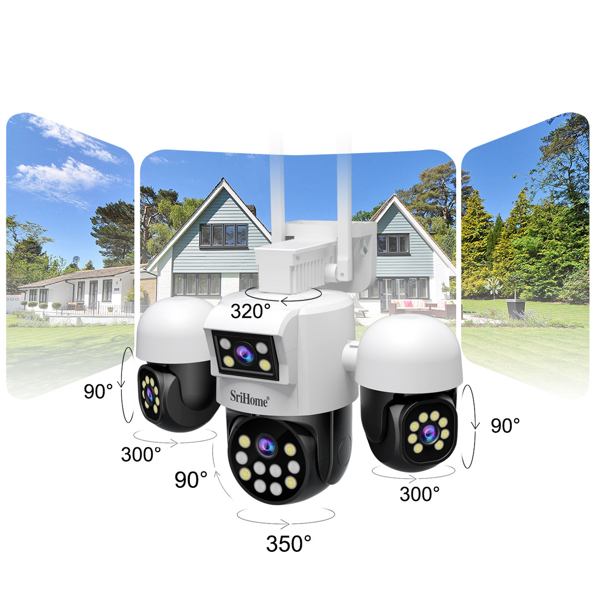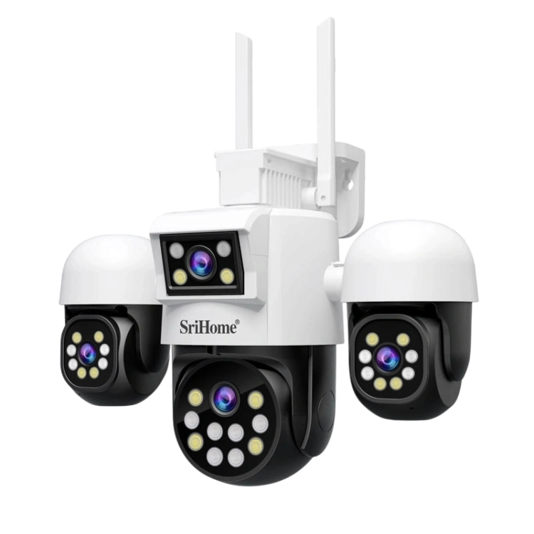 دوربین مداربسته بیسیم تحت شبکه 8 مگاپیکسل SH069 برند سری هوم (SriHome) با 4 لنز (یک لنز ثابت سه لنز چرخشی و قابلیت دید در شب رنگی دوسال گارانتی اصلی و ارسال رایگان